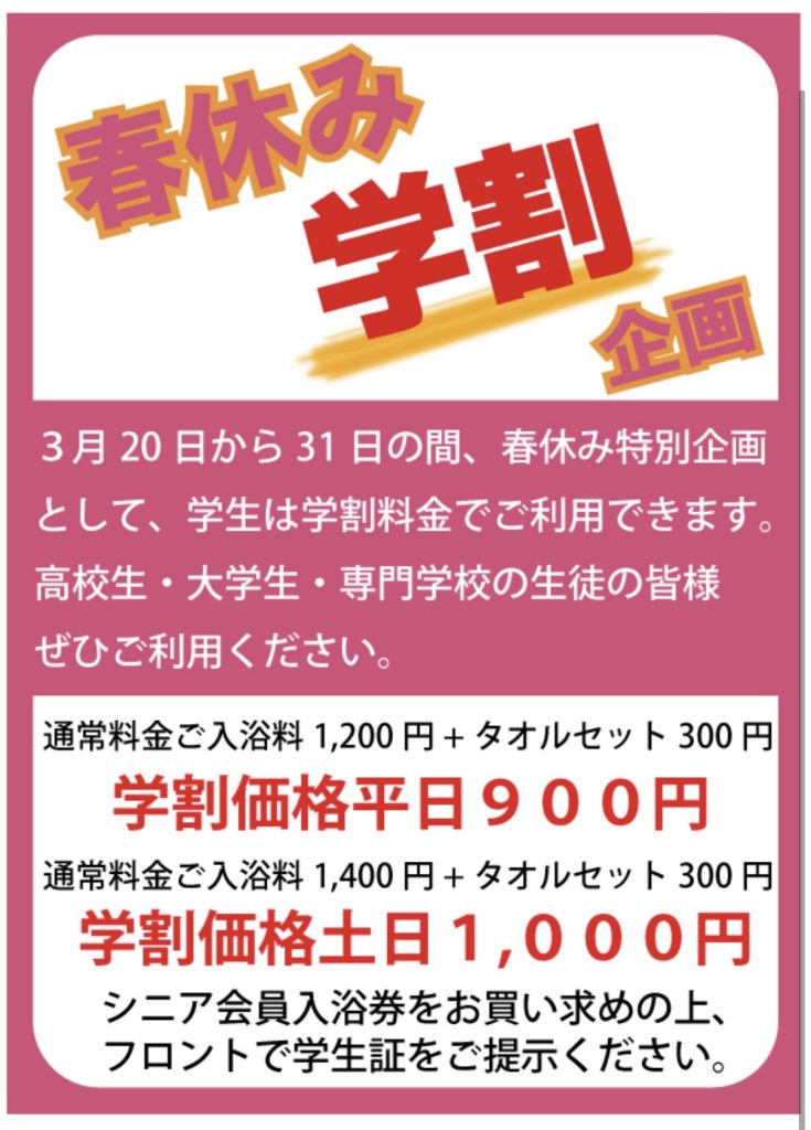 春休み学割キャンペーン 2026 3/12 お知らせ 2026年3月12日 お知らせ 2026.3イベントカレンダー 関連記事 明けましておめでとうございます! 2026年1月1日 回数券がお得です! 2025年12月30日 年末年始の料金•営業時間について 2025年12月29日 18日(木)売店14時で終了させていただきます。 2025年12月18日 12月17日(水)売店終日お休みいたします。 2025年12月16日 12月16日17時より売店休業のお知らせ 2025年12月16日 タトゥ隠しシール変更のお知らせ 2025年9月18日 男湯ドライサウナ修繕のお知らせ 2025年9月9日
